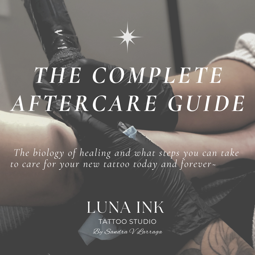 All first time clients are provided with a complimentary aftercare bag containing sample items as well as our one of a kind booklet! Concluding your appointment your artist will demonstrate proper aftercare with the products provided to you. While they should hold you over for some days, it is important to note that healing time will vary from client to client. Aftercare is an ongoing practice, consistency and cleanliness are key for optimal results. We carry retail for BOTH healing & healed tattoos. Scroll down to visit our online shop and see our full inventory here at Luna Ink! Free initial touch ups are available, and if you ever lose your booklet we’ve got you covered: